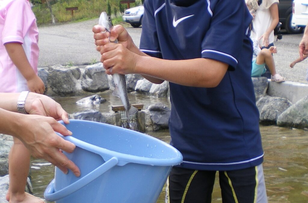 ちなみに日によっては小さなお子さまに大人気の魚のつかみ取りを開催しています。「一度やったらまたやりたくなる」という声を多くいただきます。夏休みの家族キャンプと組み合わせて楽しむ方が多い季節です。