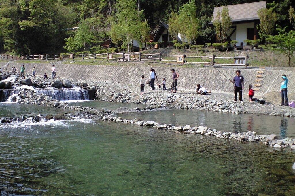 人工的な池ではなく、自然の流れがある川で魚釣りを体験できる一方で、流れが急になりすぎないよう調整されているため、子どもでも安心して竿を出せます。